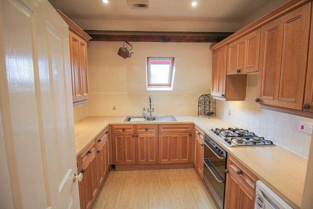 Velux window. Fitted with a range of eye and base level units with worktop surface over and tiled splash back. One and a half bowl sink and drainer with mixer tap over. Inset gas hob with electric oven under and extractor fan over. Space for under counter fridge. Integrated freezer and washing machine. Cupboard housing Valiant boiler.