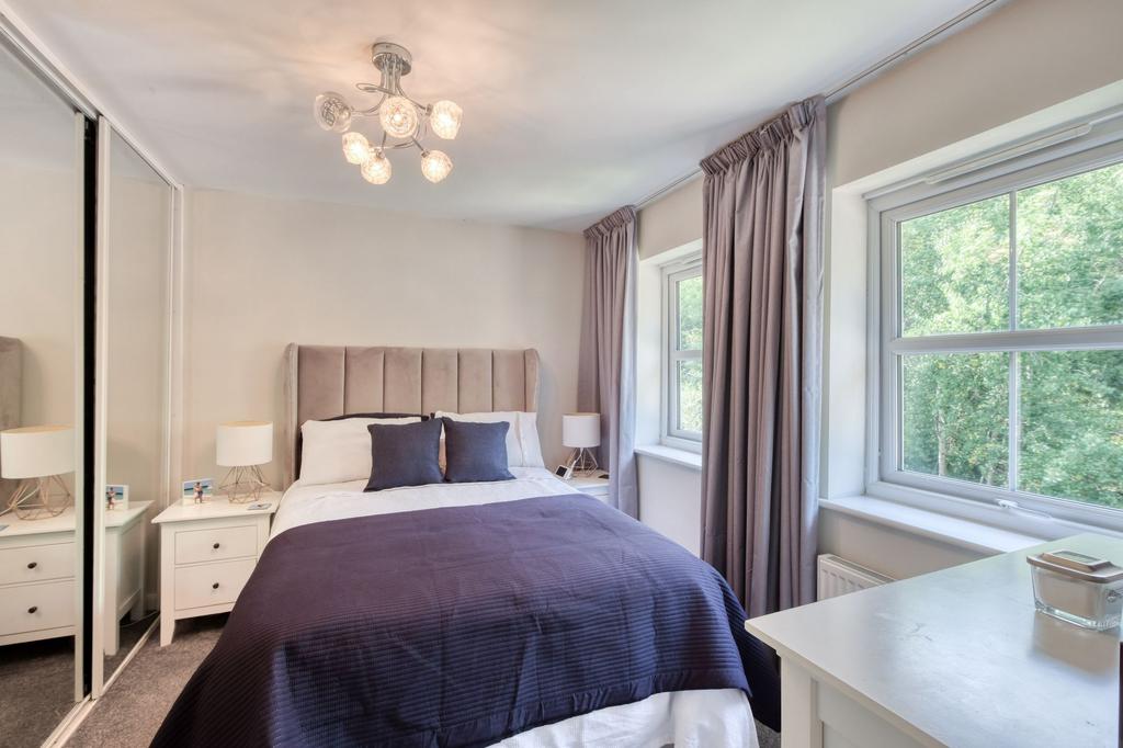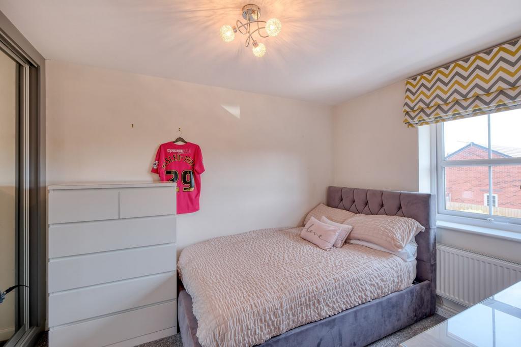The first-floor landing provides access to three well-proportioned bedrooms. The master bedroom includes fitted wardrobes and a sleek en-suite shower room. Bedroom two also benefits from fitted wardrobes, while bedroom three is ideal as a child’s room, home office, or guest room. A family bathroom completes this level.