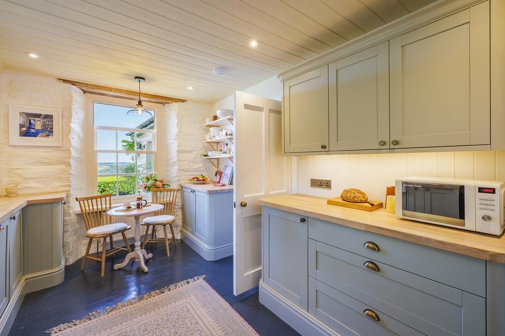 The lovely kitchen is packed with character with the neutral wooden cabinetry being carefully matched with solid wood counter tops. The room is flooded with natural light with two windows to the side and a large window looking out over the valley with space for an informal dining area in front of it. There is a range of fitted white goods along with space for a freestanding fridge/freezer. The room is finished with painted floorboards and original panelling to the ceiling. The kitchen can be accessed from both the snug and the sitting room and has a door on the front wall into the utility room.