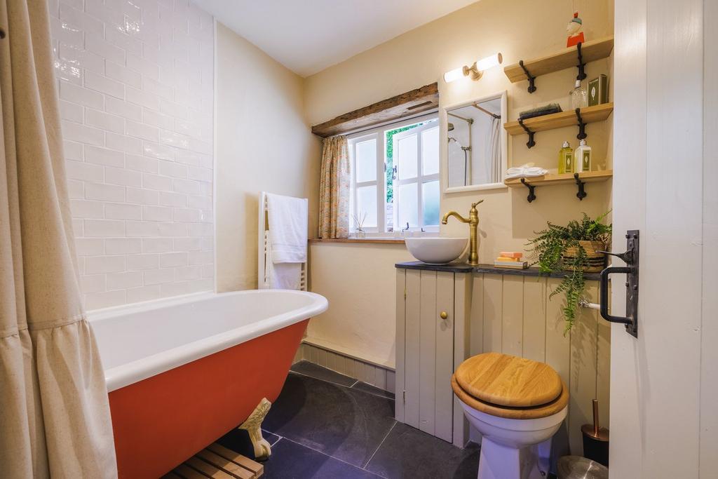 The family bathroom enjoys stunning views from the full height window in the rear wall and offers a traditional ball and claw foot bath with shower over, lavatory, and hand basin.