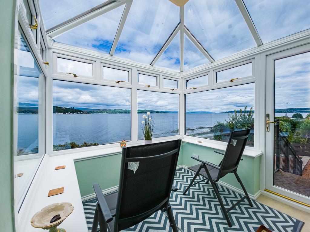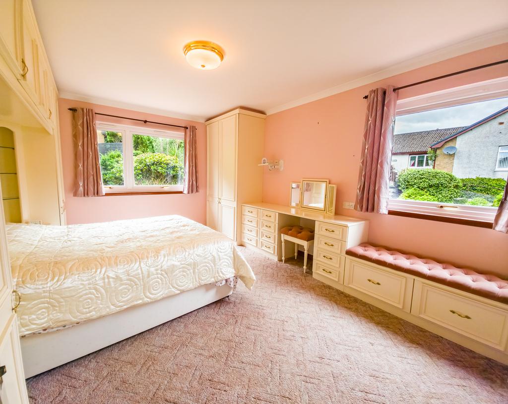 and more than enough room for a large bed and bedroom furniture. Fitted wardrobes and built-in cabinetry provide excellent storage. Dual casement windows to both the side and front elevations frame views over the Holy Loch, while a built-in cushioned window seat enhances the charm. Carpeted, with wall-mounted Dimplex heater.