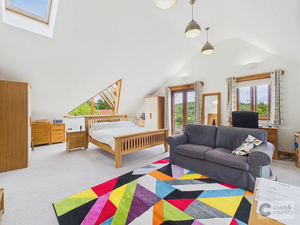 The first-floor landing is very light with vaulted ceiling, large Velux window, stained glass windows and airing cupboard with radiator. The master bedroom is a superb room with an abundance of character having a vaulted ceiling, being triple aspect and enjoying wide sweeping views over the surrounding countryside, windows to rear and side, feature window overlooking the rear garden and French doors opening onto a balcony with wrought iron railings enjoying the panoramic countryside views. Shower room with suite comprising shower cubicle, low-level WC and wash basin in vanity unit, heated towel rail and window with pleasant outlook over the garden. Bedroom two is dual-aspect with window to side, further window to rear and part-glazed door giving access to the rear garden. Bedroom three has a window with shutters enjoying a rural outlook and has access to a part boarded loft. There is a second shower room with modern suite comprising shower cubicle, low-level WC and wash basin in vanity unit, heated towel rail and window.