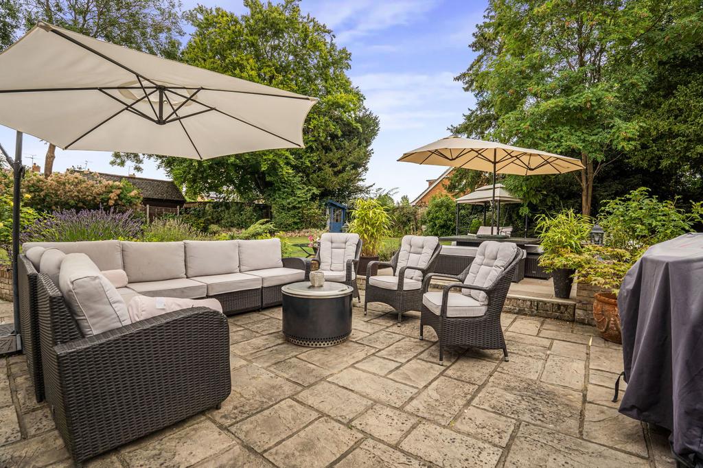 Outside, the home is framed by beautifully maintained gardens to the front and rear. A paved terrace, sweeping lawns, and mature borders offer a peaceful and private setting. To one side, a large driveway provides off-street parking for multiple vehicles and access to the impressive outbuildings.