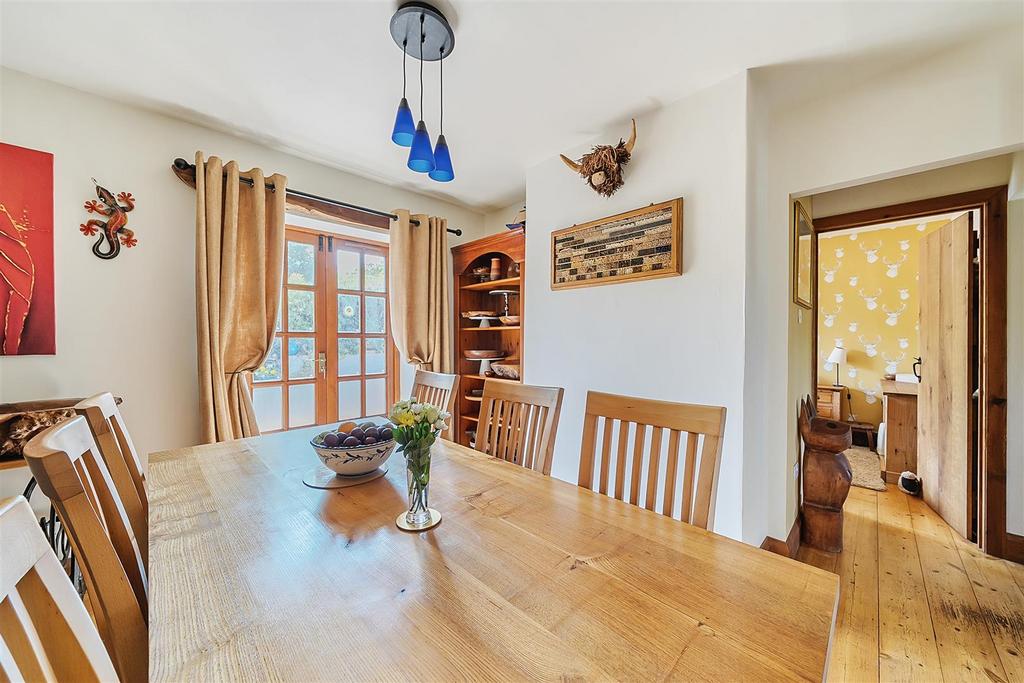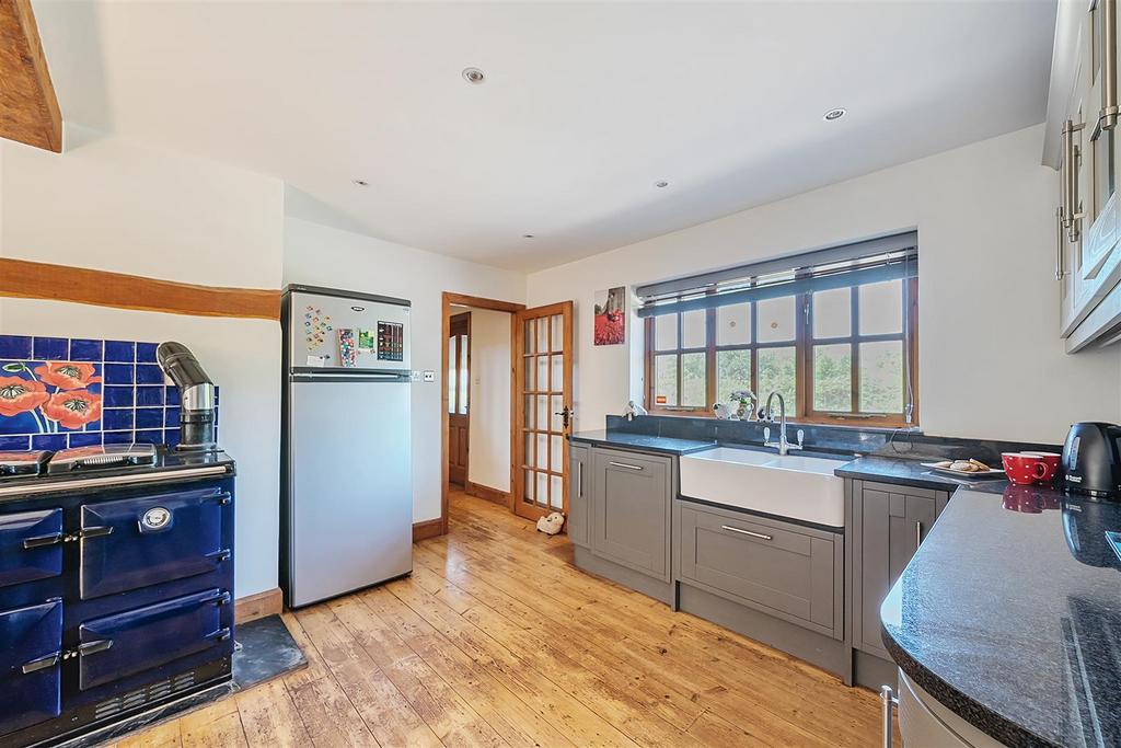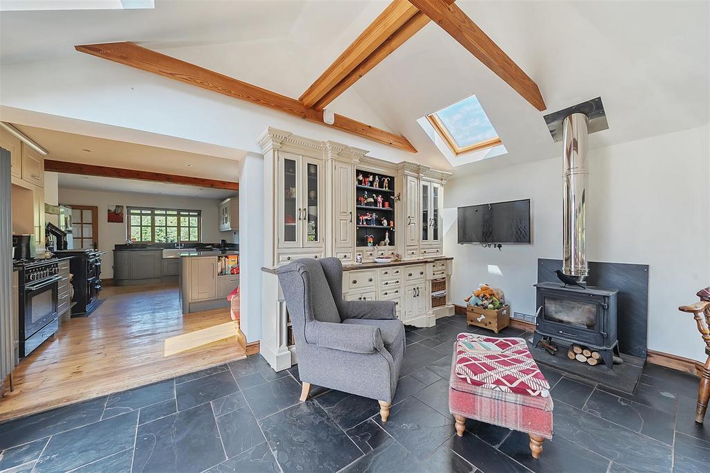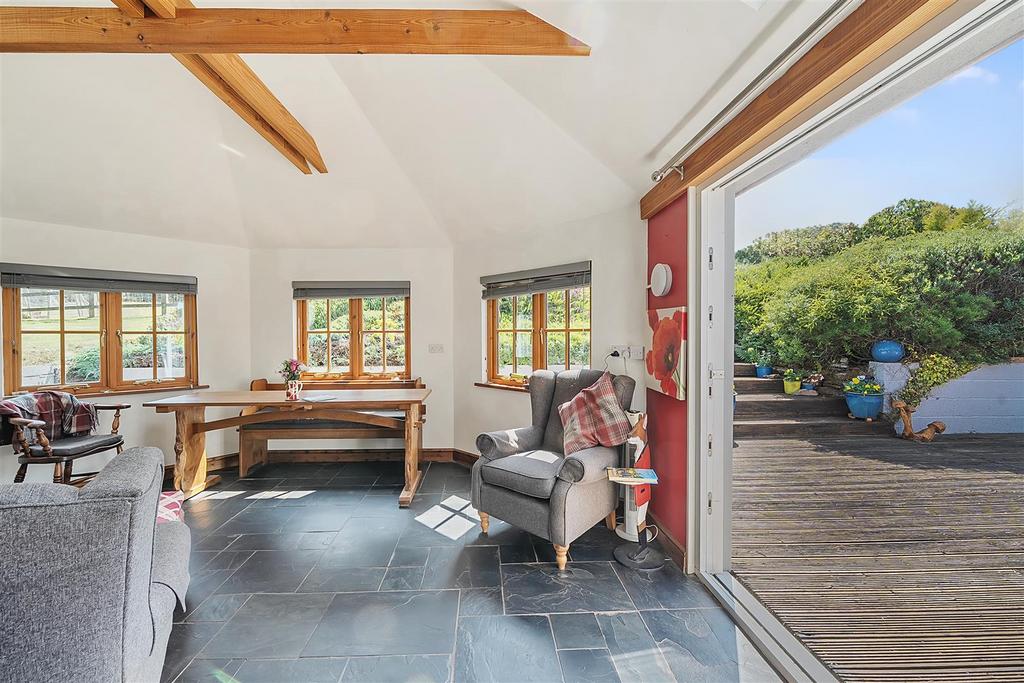 Accomodation - A porch opens into the entrance hall, with stairs rising to the first floor. The sitting room features exposed beams, a brick fireplace with wooden mantle, slate hearth and inset wood burner, and double doors opening onto the decking. The dining room also has doors to the decking. Off the hall is a further door leading to bedroom three, which overlooks the rear garden and a shower room. The kitchen is fitted with modern shaker-style wooden units, granite work surfaces, ceramic sink and an oil-fired Rayburn. A boot room and pantry provide additional storage. The day room is a light and airy room being part vaulted with tiled flooring, a log burner, and bi-fold doors giving access to the rear garden.