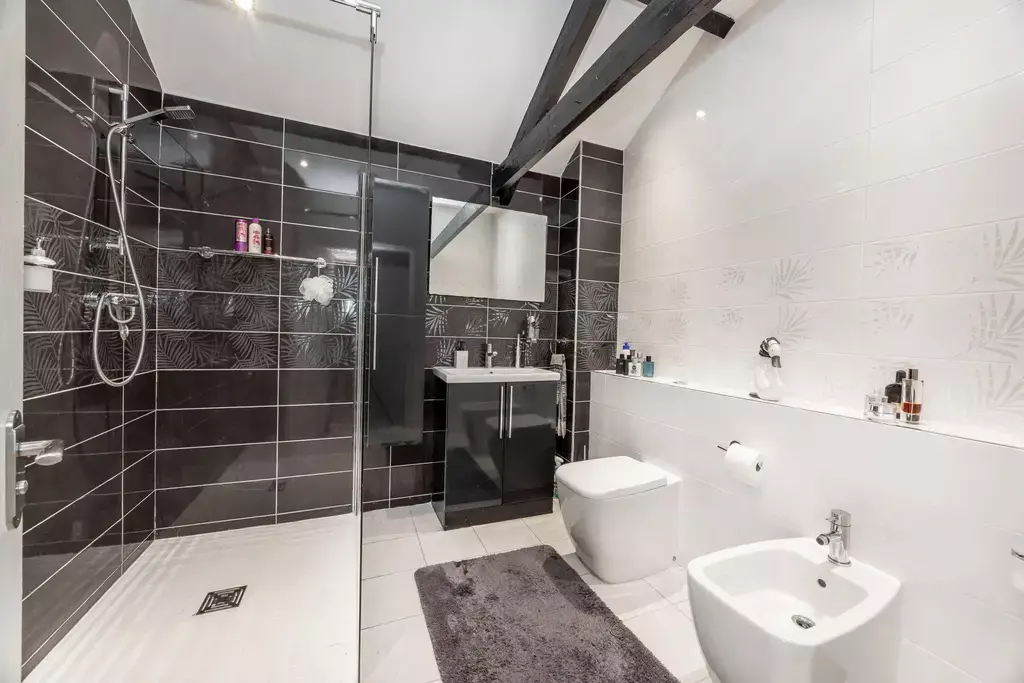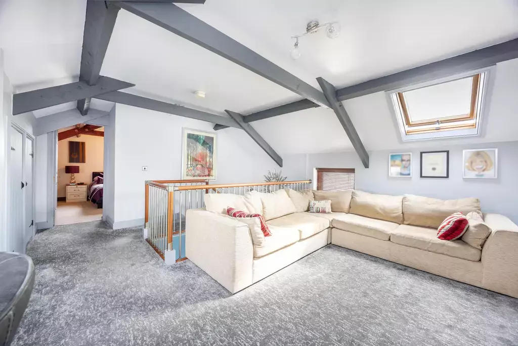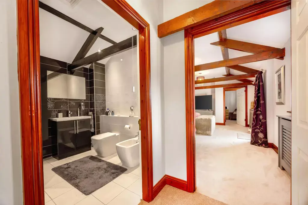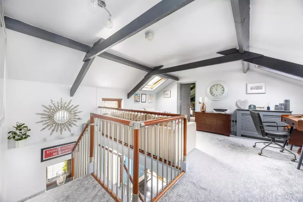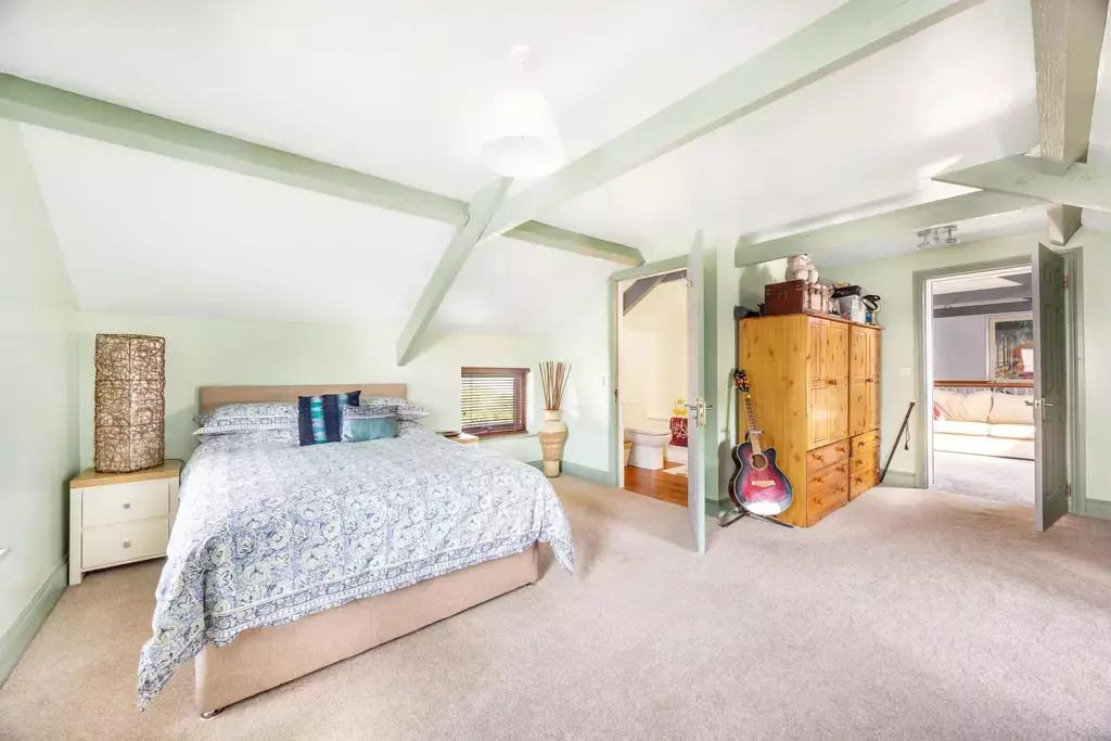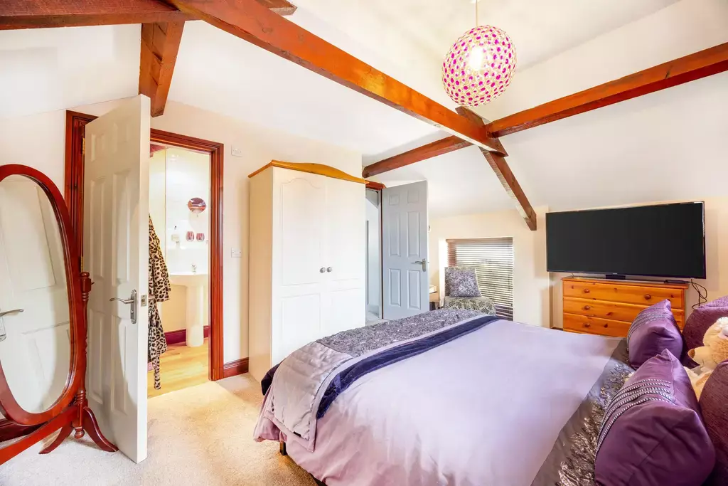 The first floor, with vaulted ceilings and exposed beams throughout, offers a relaxed lounge area and two additional double en-suite bedrooms, providing comfort and flexibility.