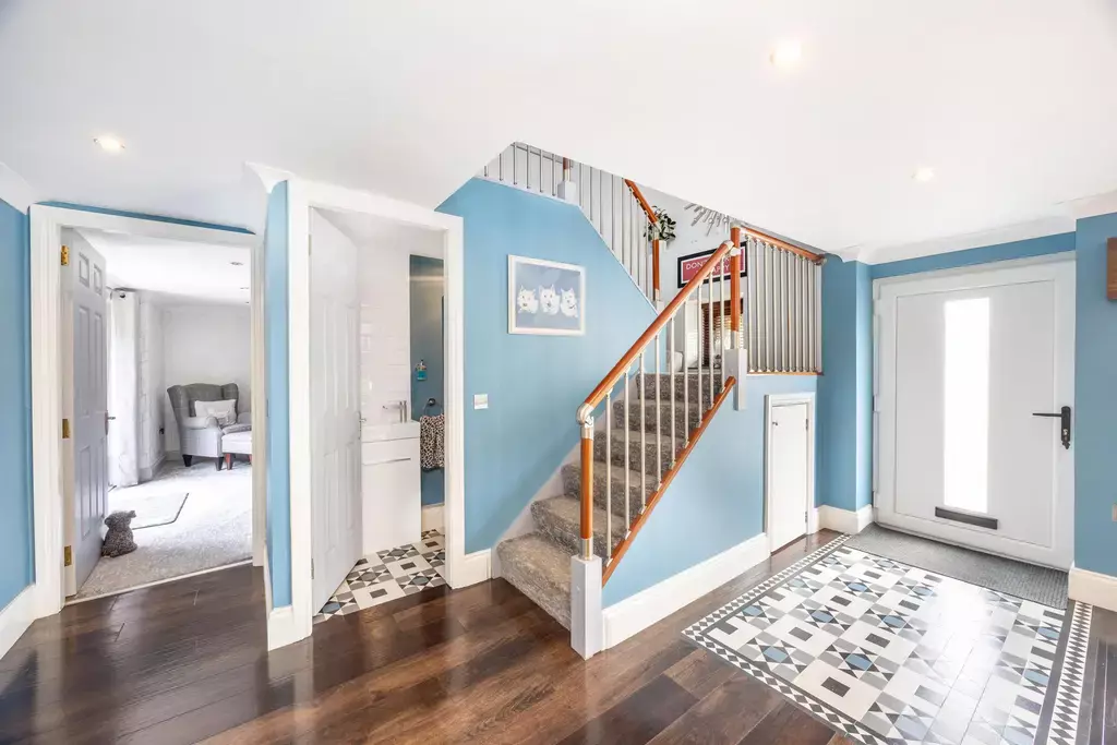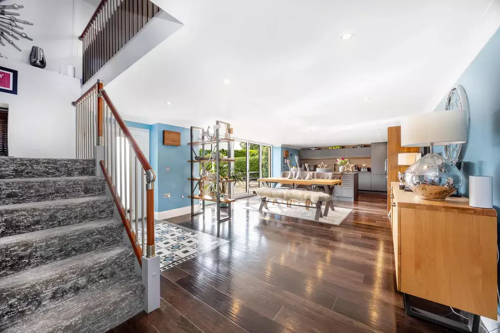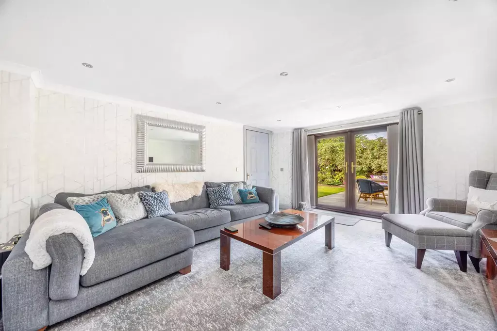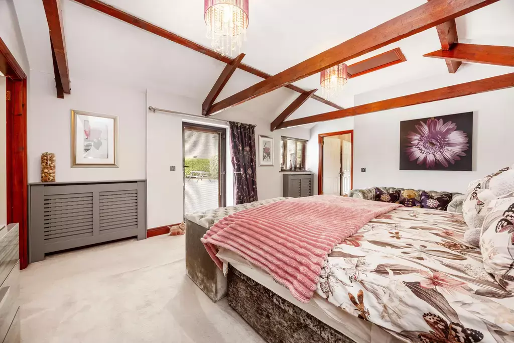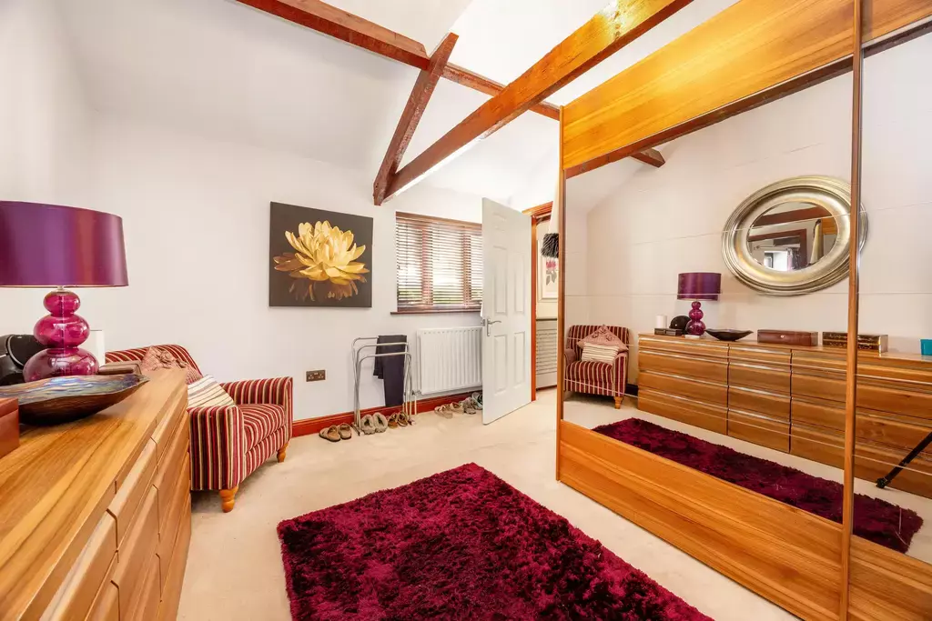 The ground floor features a warm and inviting living room with French doors opening to the rear garden, and a magnificent principal bedroom with a feature vaulted ceiling, exposed beams, a luxury en-suite shower room, and a large separate dressing room. The stunning contemporary dining kitchen and family room, with bi-folding doors to the attractive paved courtyard, provide the perfect hub for family life and entertaining.