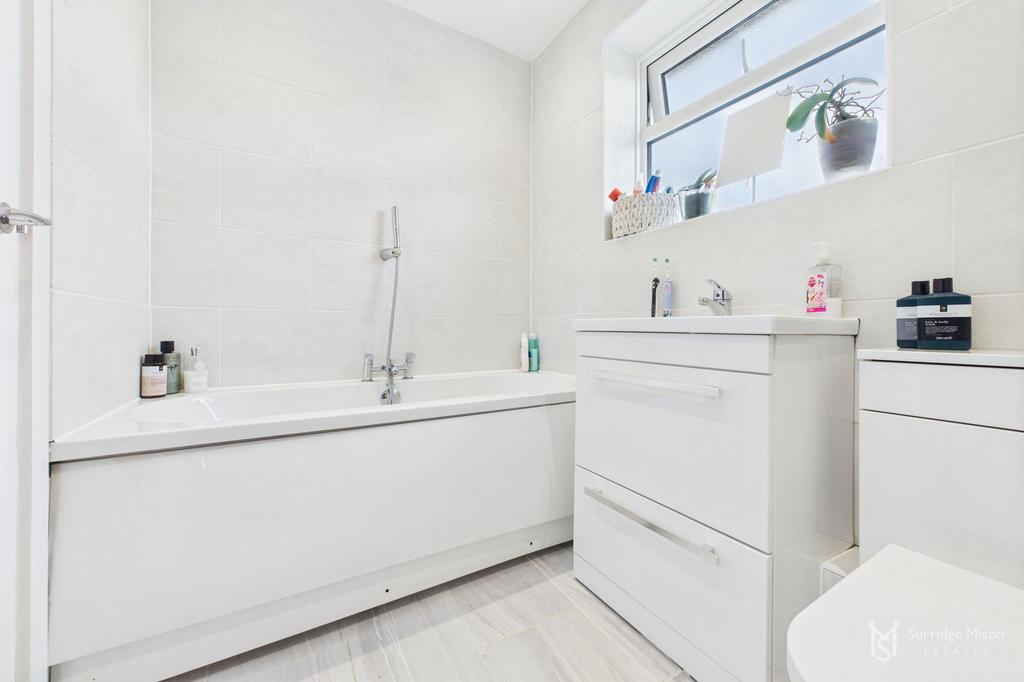 Double glazed opaque window to side. Tiled flooring and fully tiled walls. Inset spotlights. Extractor fan. Chrome towel rail. Modern suite compromising of bath with mixer taps and handheld shower attachment, walk-in shower enclosure, wash hand basin set within vanity unit and W.C with concealed cistern.