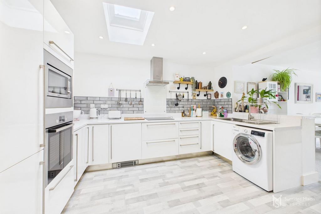 Feature skylight. Laminate flooring and partially tiled walls. Inset spotlights. Fully fitted with a range of modern wall and base units with space and plumbing for fridge/freezer, washing machine and dishwasher. Built in eye level Bosch electric oven and Swan microwave. White work surfaces with inset 4 burner electric hob with Hotpoint stainless steel cooker hood and glass splashback and stainless steel 1 and 1/2 bowl sink and drainer unit.