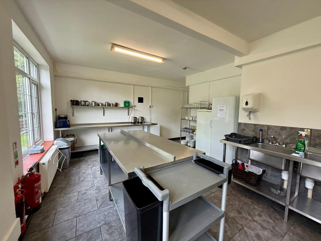 Stainless steel worktops, 2 gas stoves, 1 electric oven, 2 fridges, stainless steel double sink and double drainer, extractor fans, radiator, fire exit, ceramic tiled floor.
