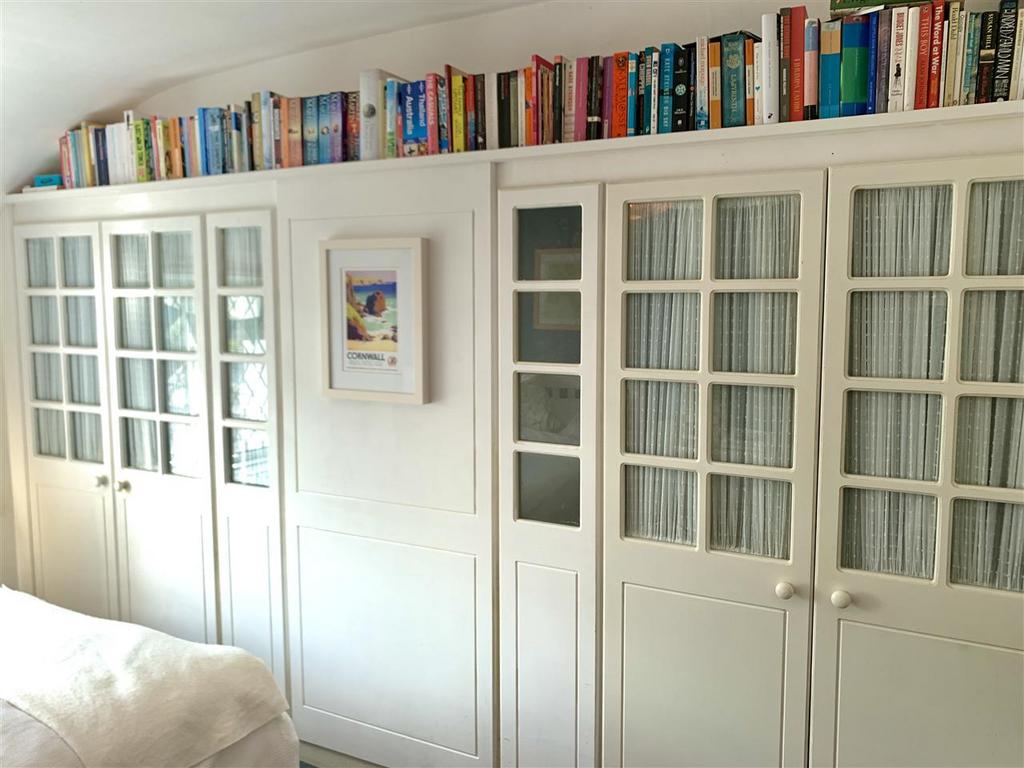 This fabulous bedroom features an imaginative range of fitted wardrobes, custom built around the curved fire breast and having multi-paned doors screened by curtains, arched overhead bookshelves. This bedroom also has recessed leaded light double glazed windows enjoying much the same views as bedroom one, plastered canopied ceilings, radiator, pine latch and brace door.