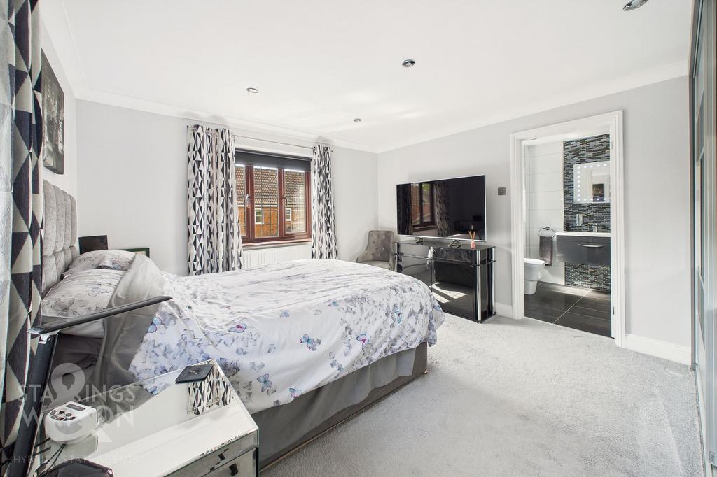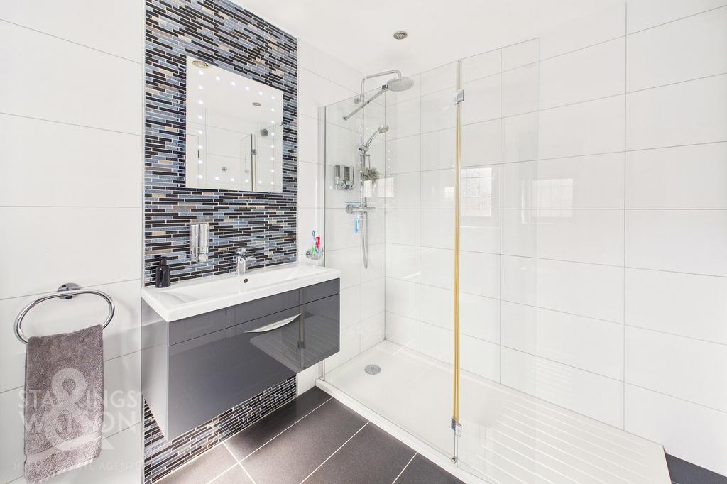 Ascending the staircase to the carpeted first floor landing, loft access can be found above with a useful storage cupboard at the end of the hallway. To the right the main bedroom can be found also enjoying a dual aspect, flooding the room with natural light, whilst generous sliding fitted wardrobes can be found one side with the door at the end of the room opening to a modern three piece en-suite including a double open shower with a glass splashback, wall mounted heated towel rail and vanity storage below the sink. From the hallway, doors open to three further double bedrooms, with the two larger rooms also benefiting from fitted wardrobes. Completing the accommodation, the four piece family bathroom offers a freestanding bath, underfloor heating, a further wall mounted heated towel rail, a glass enclosed shower cubicle with a dual sink and vanity storage beneath.