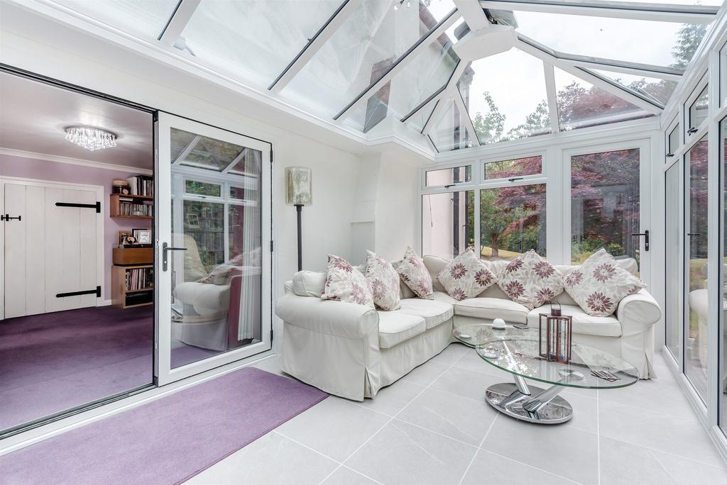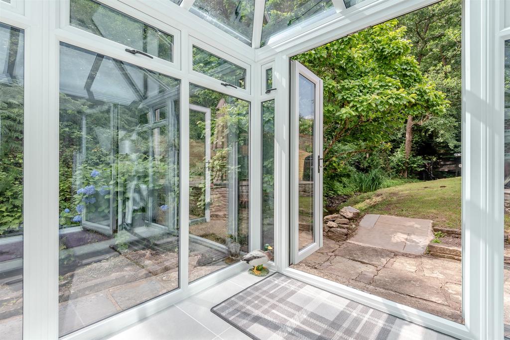 From the living room, French doors take you into a wonderful, recently added conservatory, with an atrium style roof allowing light to flood into the room. There is a beautiful outlook over the gardens, stream and waterfall, with doors taking you outside.