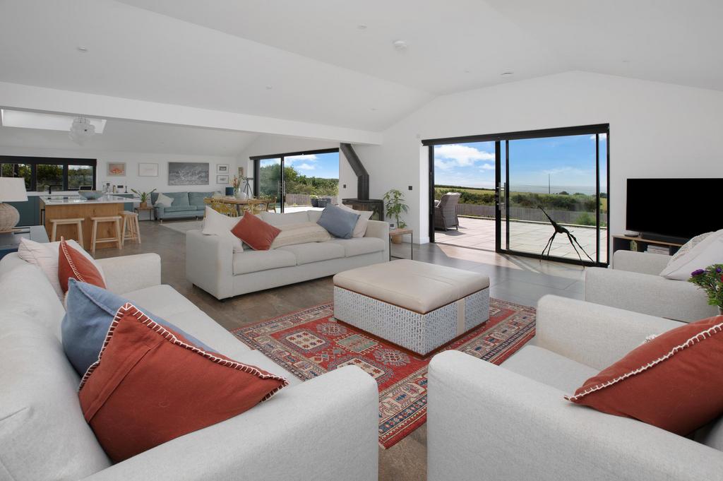The principal focus of the house is the voluminous open-plan living space, flowing through kitchen, dining and sitting areas, with wide sliding glazed doors revealing views towards Gerrans Bay and Portscatho, and including a state of the art Dick Guerts woodburner.