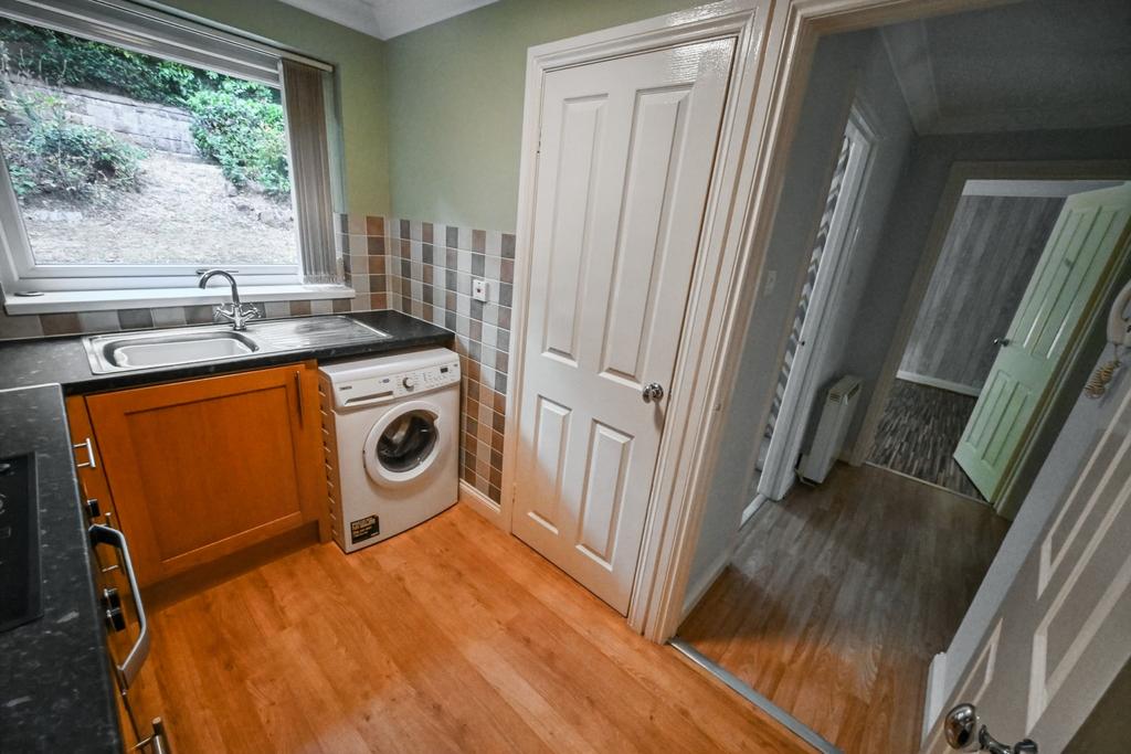 Kitchen: 9’1’’ (2.78m) x 6’9’’ (2.06m) Fitted with a matching suite of laminate style units comprising stainless steel single drainer sink unit, a range of base cupboards, drawers & suspended wall cupboards, matching worktops, stainless steel single drainer sink unit with mixer tap, built in electric oven, 4-ring electric hob with stainless steel extractor hood over, plumbing for washing machine, tiled splash backs, coved ceiling, laminate flooring, built in airing cupboard and double glazed window to rear.