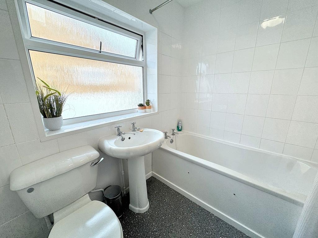 Fitted with a three piece suite in white comprising of a low flush wc, pedestal wash hand basin, panelled bath with shower over. Fully tiled walls, lighting, radiator and obscure glazed window to the side of the property.