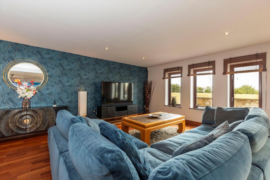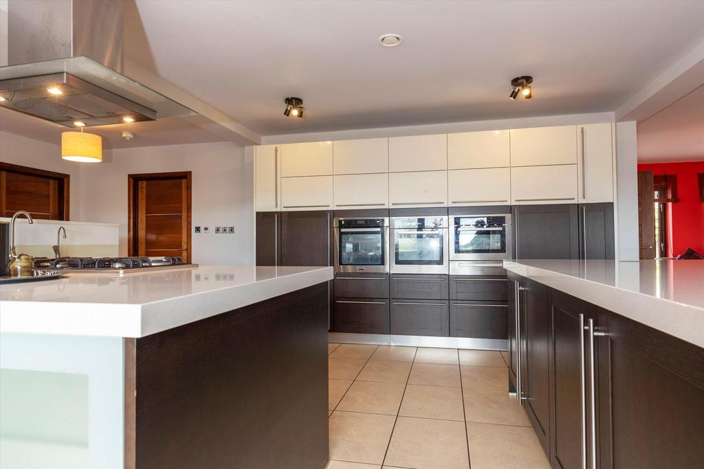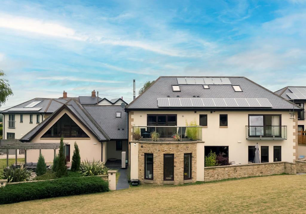 This outstanding residence extends to over 5,500 sq ft and has been meticulously designed to an exceptional standard, combining spacious, versatile accommodation with a contemporary, eco-conscious specification. A soaring atrium entrance hall sets the tone, flowing into over 44 feet of open-plan living space which includes a bespoke walnut and white high-gloss kitchen with premium integrated appliances, a feature slate wall with a wood burning stove, and a seamless transition into a bright orangery with garden views.
