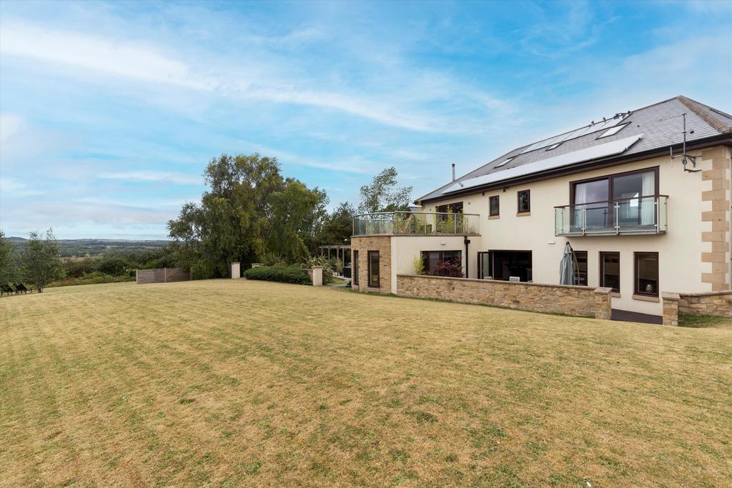 To the front, the property enjoys a formal courtyard with natural gravel driveway, spiral topiary, and attractive stone pillars. There is ample parking and a double garage with internal access and control systems for rainwater management. The rear of the property features a south-facing decked terrace with LED lighting, leading onto expansive lawns, a wildflower meadow, and a secluded BBQ area. A further landscaped west garden includes raised beds, a pond, and breathtaking views over open countryside towards Durham Cathedral. A private orchard offers a variety of mature fruit trees.