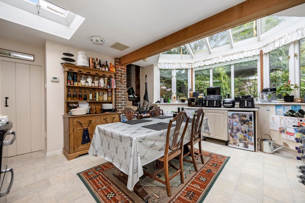 The light and airy kitchen is a true highlight, with a partial conservatory and ample cupboard and worktop space, plus room for a large dining table, ideal for social gatherings or relaxed family meals. From here, a door opens out to the South-Facing rear garden.