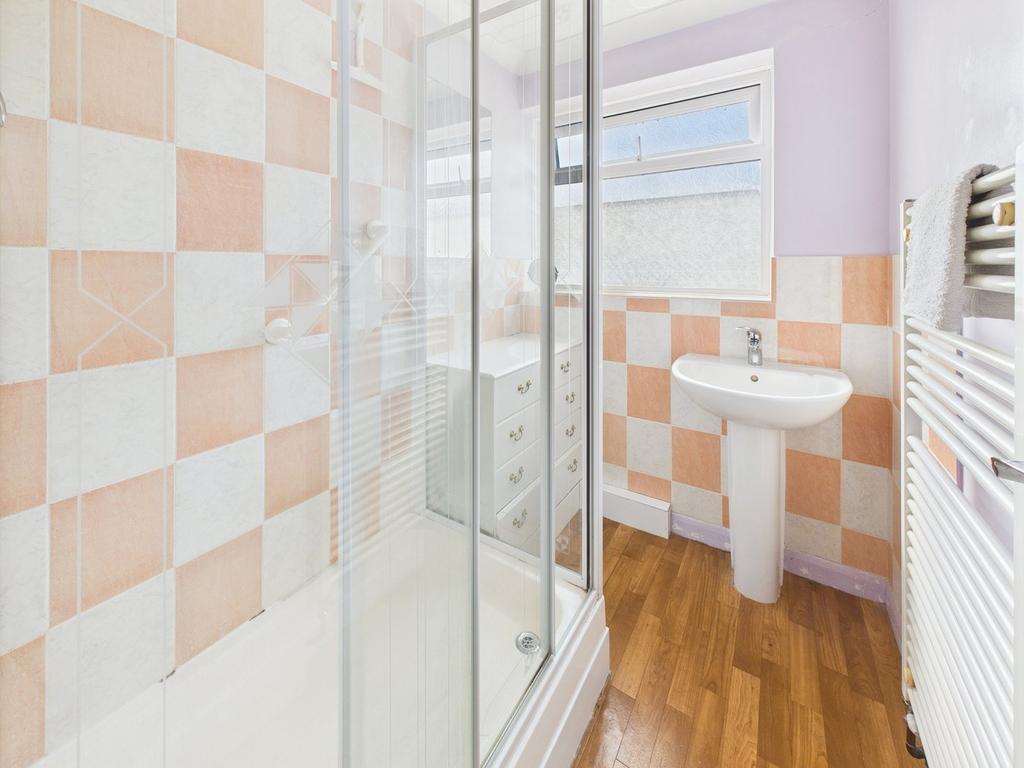 4' 11" x 6' 3" (1.50m x 1.91m) UPVC Triple glazed window to front. Shower cubicle. Wash hand basin. Heated towel rail.