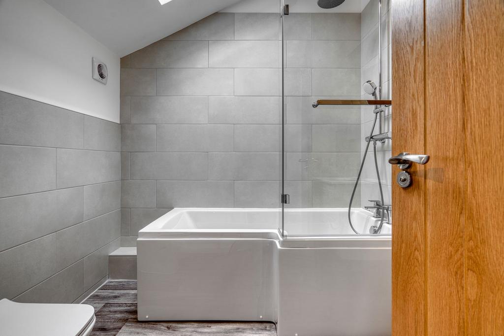 Located on the first floor, the property features two stylish bathrooms designed for comfort and practicality. The main bathroom, positioned just off the landing, offers a sleek walk-in shower, WC, and basin finished with contemporary fittings. The second bathroom, accessed through the separate dressing room, serves as a private en-suite-style space, thoughtfully designed with modern fixtures to complement the home’s elegant and flexible layout.