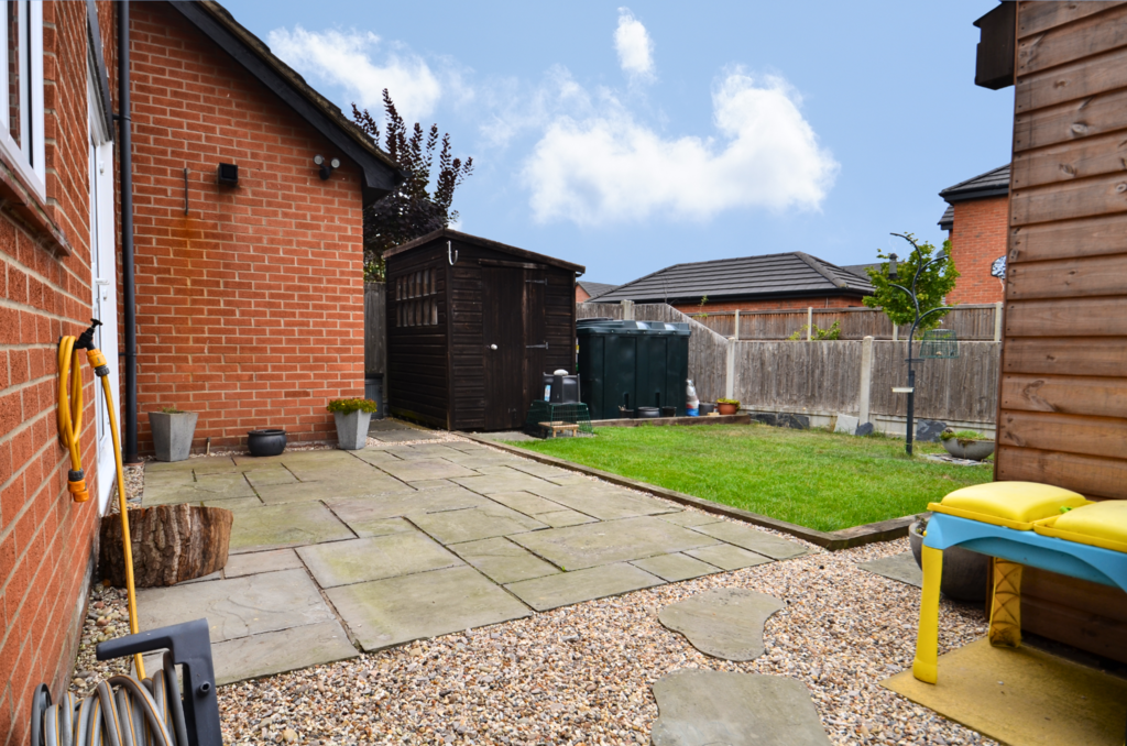 A generous and private garden, mainly laid to lawn with patio, enclosed by panel fence, summerhouse to enjoy in all seasons.