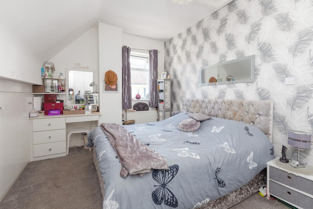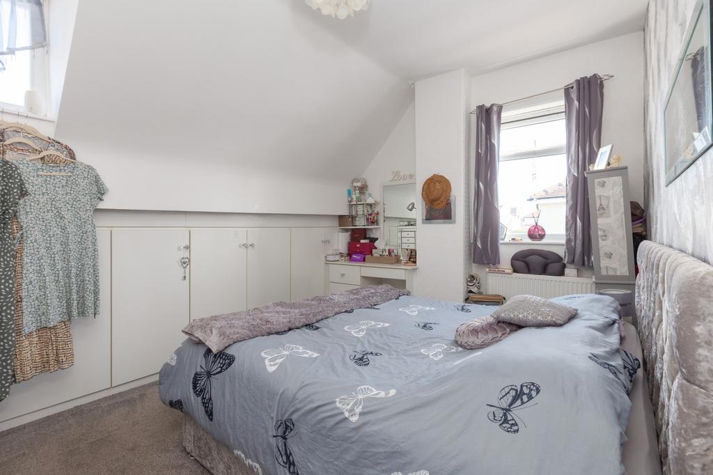 To the first floor, the landing leads to two spacious bedrooms. The master bedroom to the front benefits from fitted wardrobes and drawers, under-eaves storage, dual aspect windows to the front and side, and a radiator. The second bedroom is another generous double with a large window to the side and radiator. The family bathroom is fitted with a three-piece suite comprising panelled bath with thermostatic shower over, pedestal wash basin, low flush WC, tiled walls, and ladder radiator.