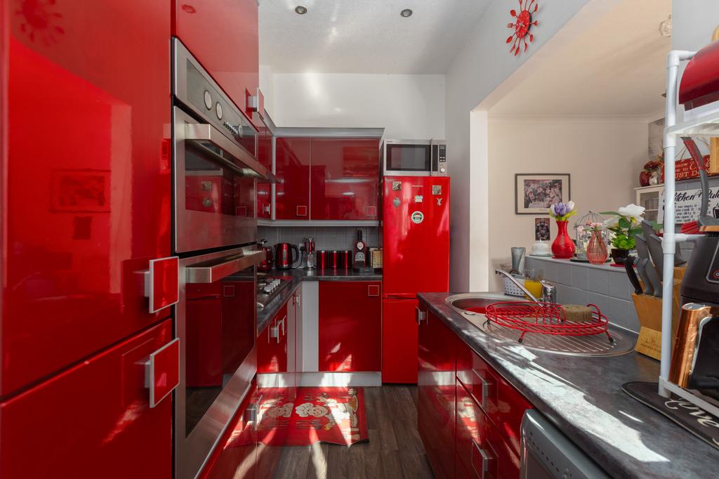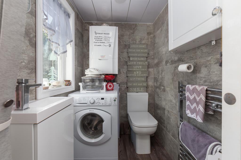 The kitchen is fitted with a range of wall and base units, complemented by work surfaces and an integrated stainless steel sink with drainer. Appliances include an electric oven and grill, four-ring gas hob with extractor over, and plumbing for a dishwasher, with space for a freestanding fridge freezer. Beyond the kitchen is a rear hall which provides access to the garden and to a handy downstairs WC, comprising low flush WC, vanity wash basin, and housing for the combi boiler, as well as plumbing for a washing machine.