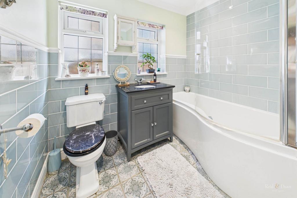 Featuring fully tiled flooring and part tiled walls throughout. W/C along with large basin vanity unit and cruze p shaped shower bath. Feature cast iron radiator and dual windows to the side aspect.