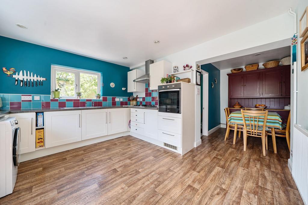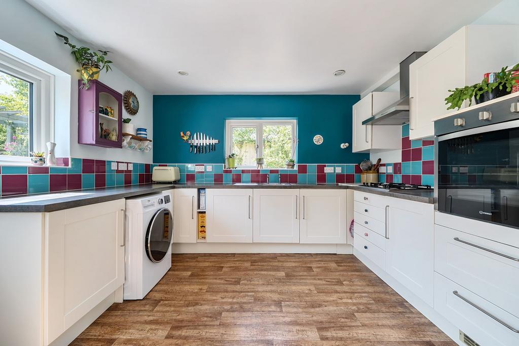 A stylish dual-aspect kitchen/breakfast room is fitted with a range of units, chic tiled splashback and has an integrated eye level oven, gas hob, and space for a fridge freezer and plumbing for appliances.