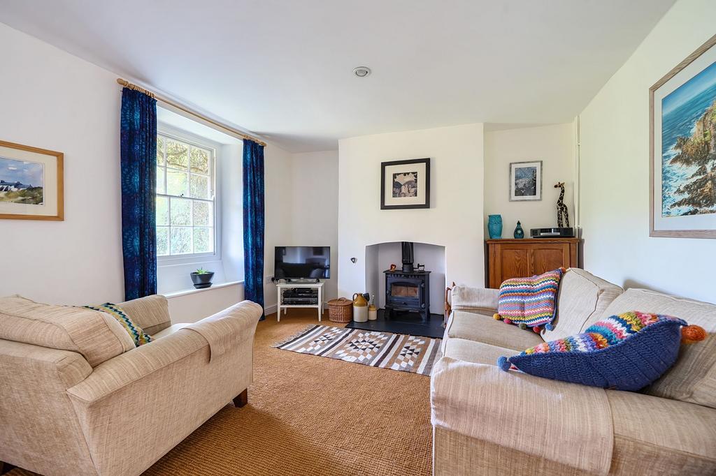 Inside, the accommodation is full of character: the main sitting/dining room, part of the original two-up, two-down cottage, features sash windows with deep sills, a recessed fireplace with wood-burning stove, and exposed period details.