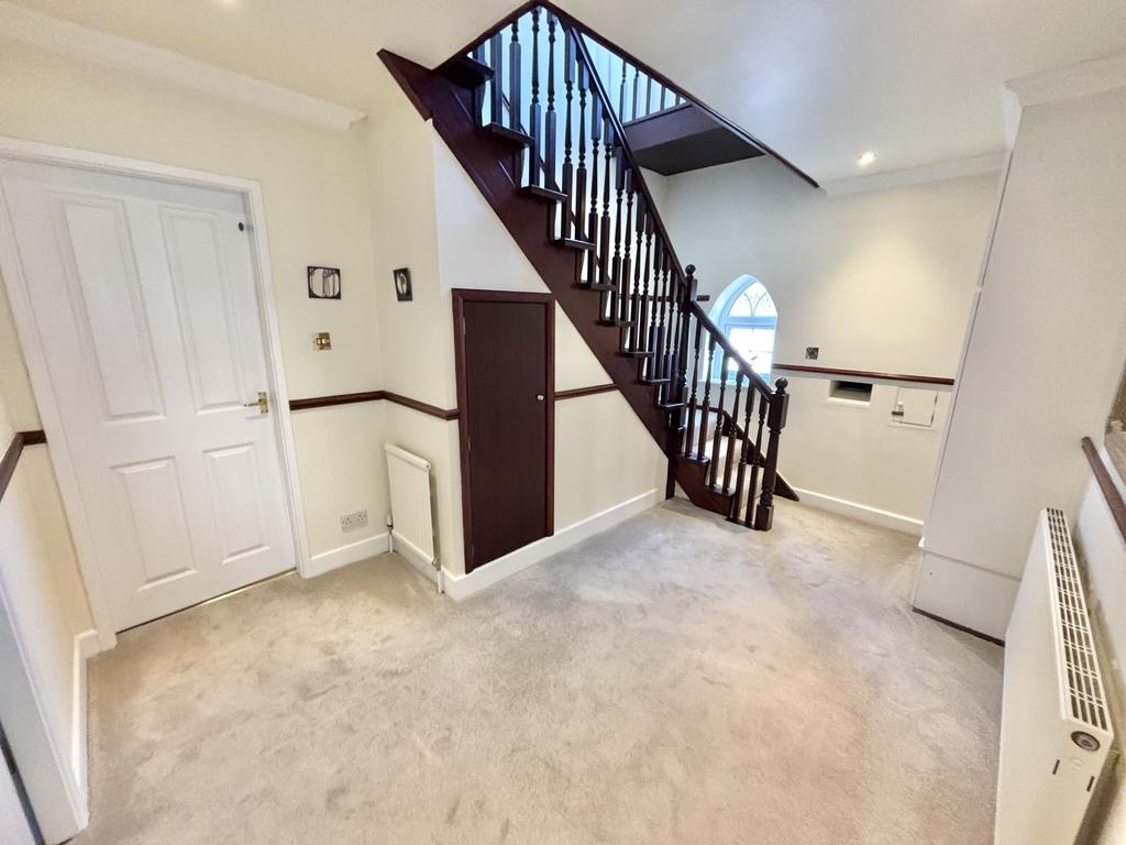 Impressive hallway with stairs leading to first floor, under stairs storage, UPVC double glazed arched window to the side aspect, radiator.