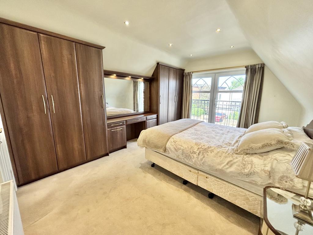 UPVC double glazed patio doors opening onto the front aspect juliet balcony, a range of fitted wardrobes/storage, radiator.