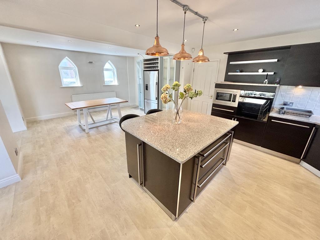 UPVC double glazed window to the side aspect, modern fitted high spec kitchen with a matching range of base and wall units, electric aga oven, integrated oven and microwave, dishwasher, centre island, granite worktops, double glazed arched windows to the side aspect, door providing external access, radiator.