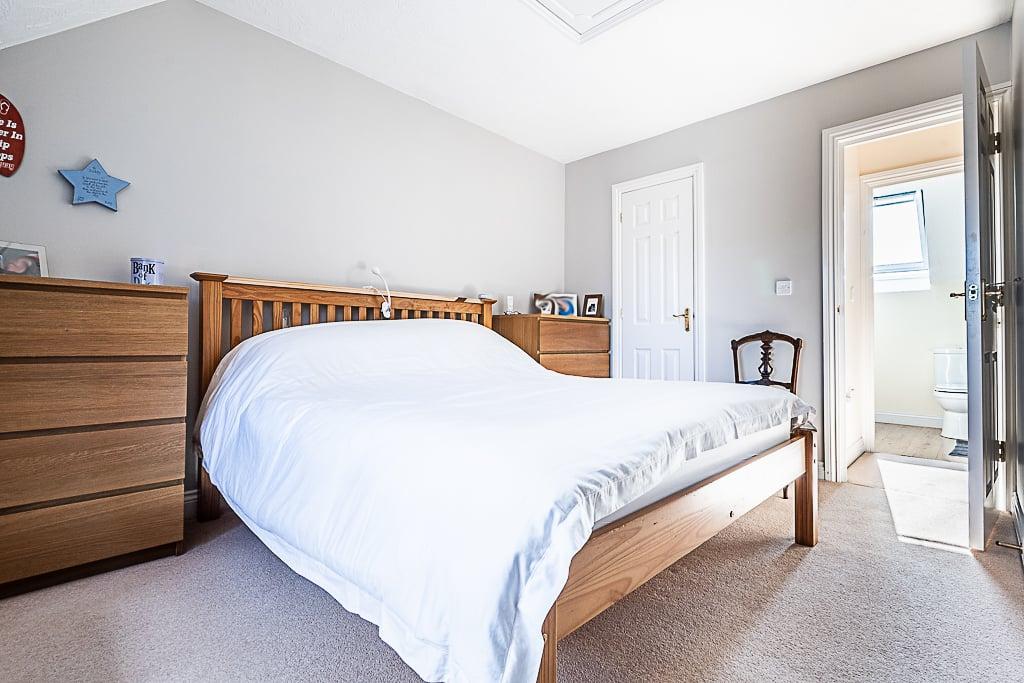 Ensuite Bathroom: UPVC double glazed velux window, walk in shower cubicle with wall mounted shower. WC, wall mounted vanity unit with rolled work surface and sink with taps. Wall mounted mirror situated above, and wall mounted towel rail and shaving socket, extractor fan and ceiling light fitting.