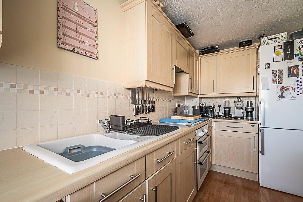 Kitchen: UPVC double glazed window to the front elevation of the property, a single gas central heated radiator, wall mounted gas fuelled boiler. The kitchen is fitted with a good range of low and eye level units with rolled edge work surface with inset sink and drainer unit with mixer taps. Integrated gas ring hob with integrated oven situated beneath. Wall mounted breakfast bar with space underneath for stools or storage. Space and plumbing for washing machine, space for free standing fridge/freezer and tiled splash back and a single ceiling light fitting.