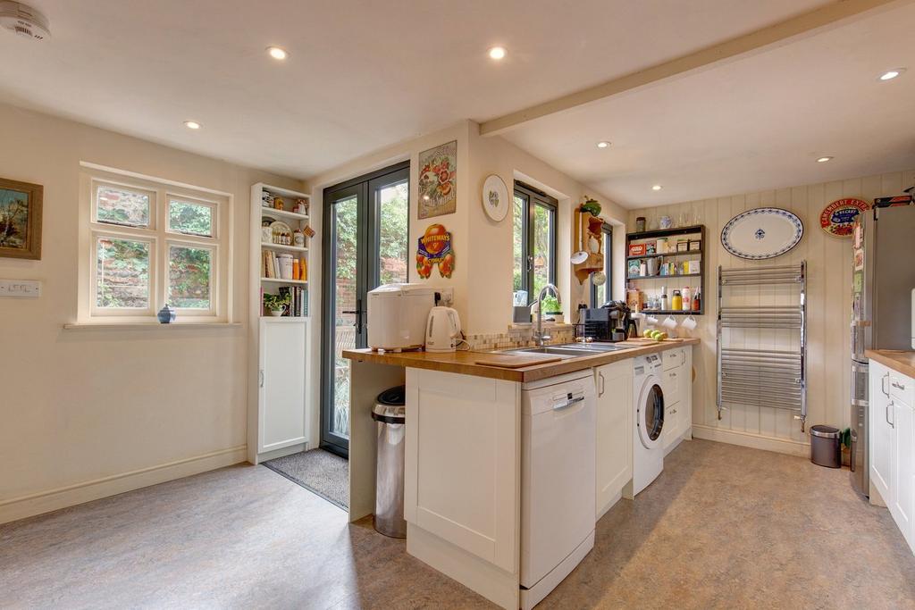 L-shaped kitchen with an extensive range of fitted Shaker style base and wall units with woodblock worktops over incorporating a stainless steel one and a half bowl sink unit with mixer tap, tiled splashback. Space for a cooker with a stainless steel splashback and extractor hood over, spaces and plumbing for a dishwasher, washing machine and fridge freezer. Chrome ladder style radiator, recessed ceiling lights, Marmoleum flooring, 3 windows to the side and south facing French doors leading outside to the rear garden. Door to: