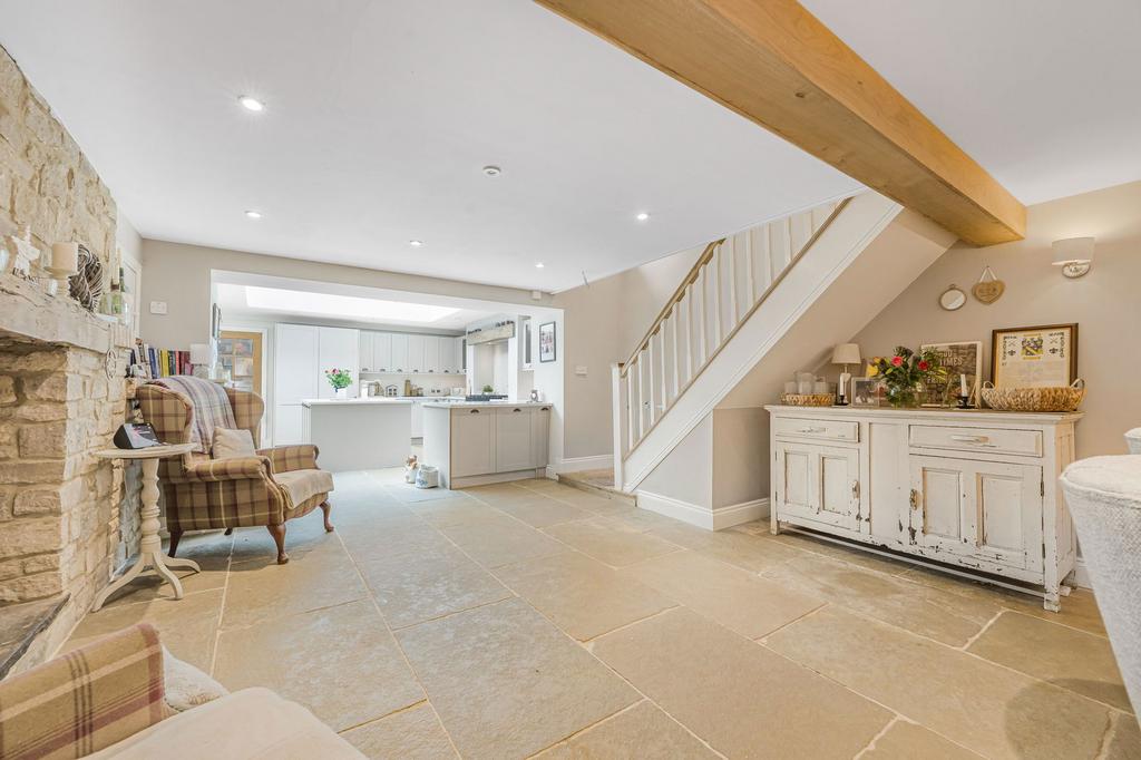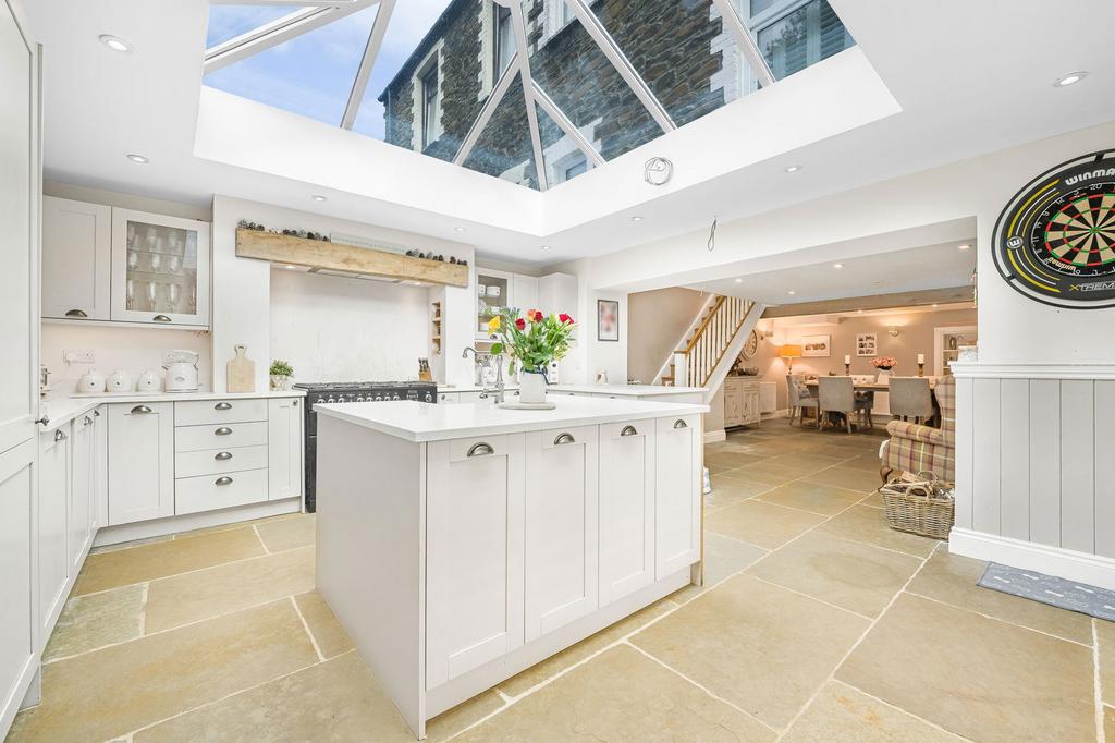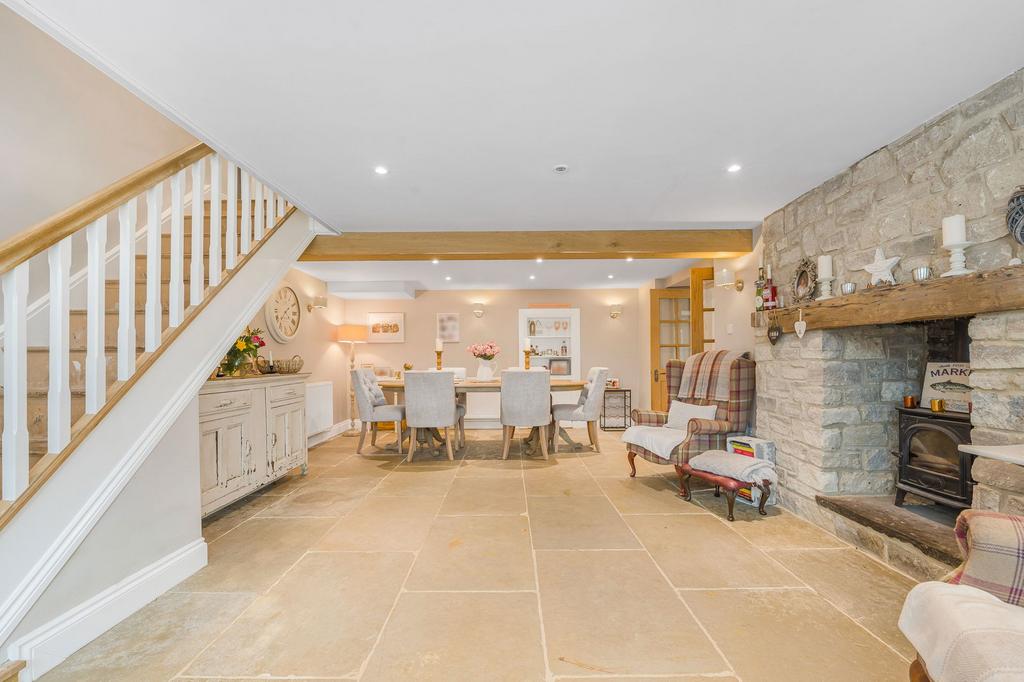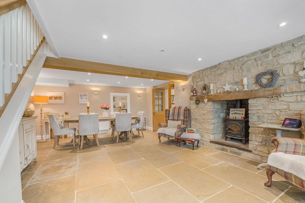 On the lower ground floor, you’ll find a practical boot/utility room with WC, a fantastic kitchen/diner with limestone flooring, orangery-style roof and log burner, and a good-sized lounge with its own log burner and exposed beams. A lovely mix of light, space and character.