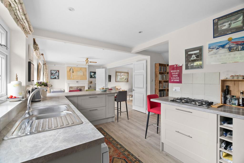 The upstairs accommodation features three well-proportioned bedrooms, including a particularly generous principal bedroom measuring 16’5” by 11’4”. A contemporary family bathroom serves the first floor.