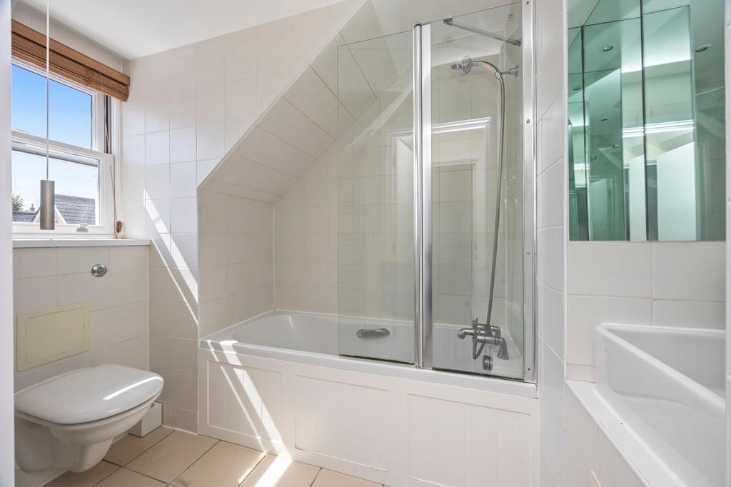Upstairs, the first floor opens into a bright, wrap-around living area with French doors to the dining space and a stylish kitchen fitted with sleek white gloss units and plenty of storage. Large windows bring in lots of natural light and offer pleasant views down the mews.
