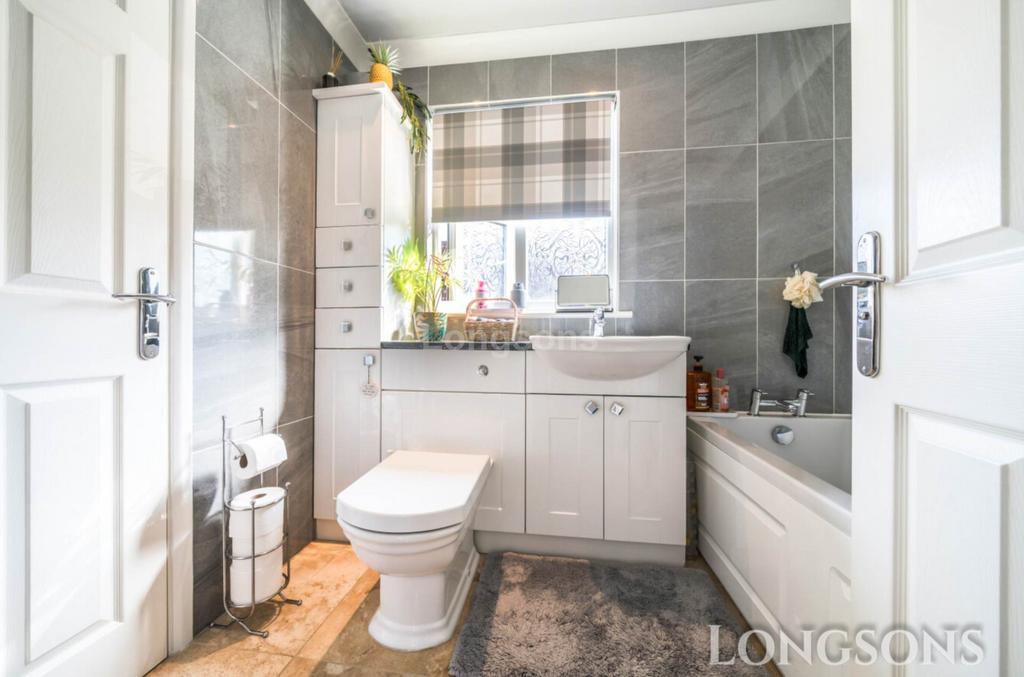 Modern bathroom suite comprising bath with shower over and shower screen, wash basin and WC both set within fitted cabinet, built in storage cupboard, towel radiator, fully tiled walls, extractor fan, obscure glass UPVC double glazed window to side.