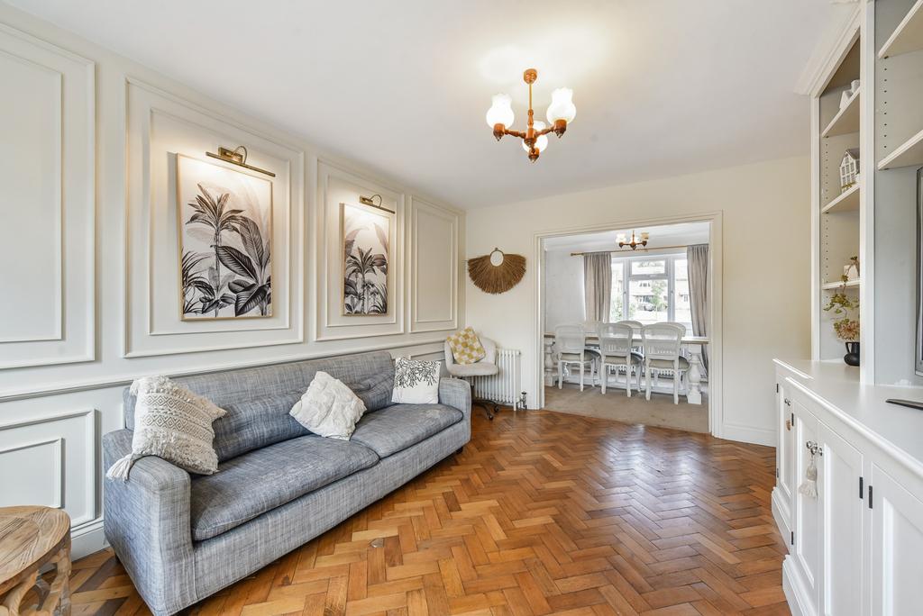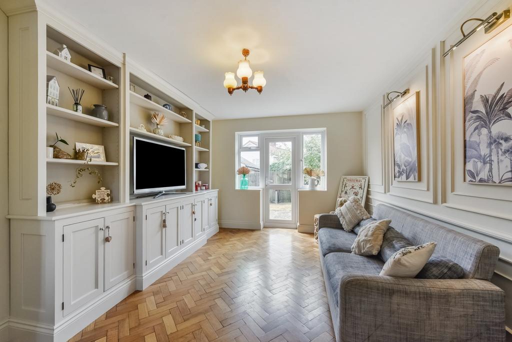 Parquet flooring, with additional matching flooring available to complete the dining room and hallway. The room features wall panelling, a built-in TV unit with shelving and storage-being left with the property-and a door leading out to the garden.