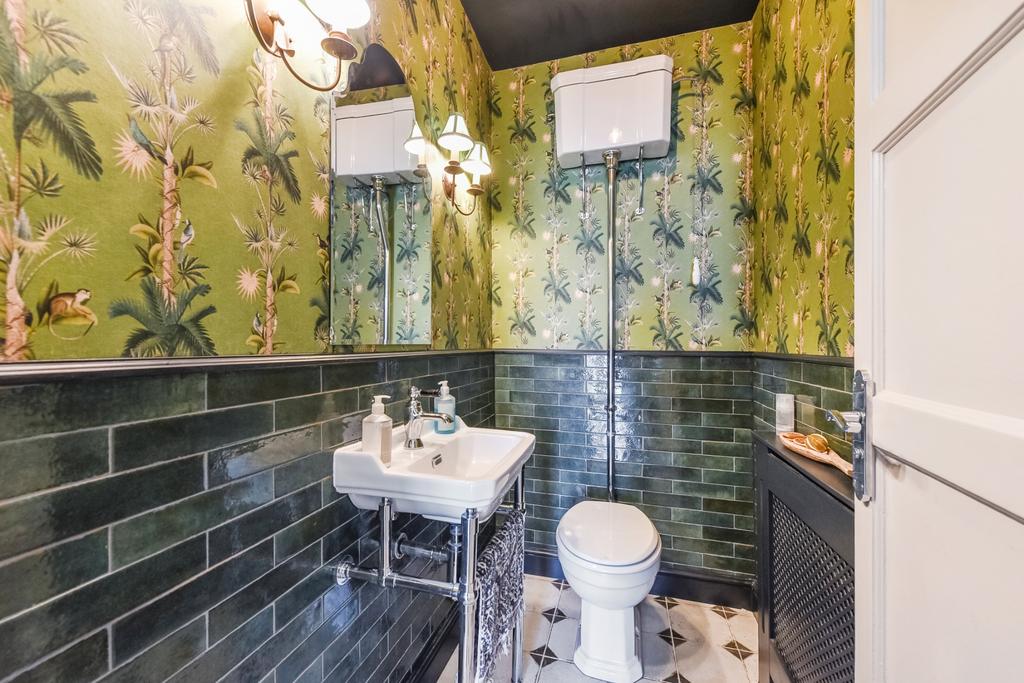 Well-presented WC with a toilet, basin, and an electric radiator.