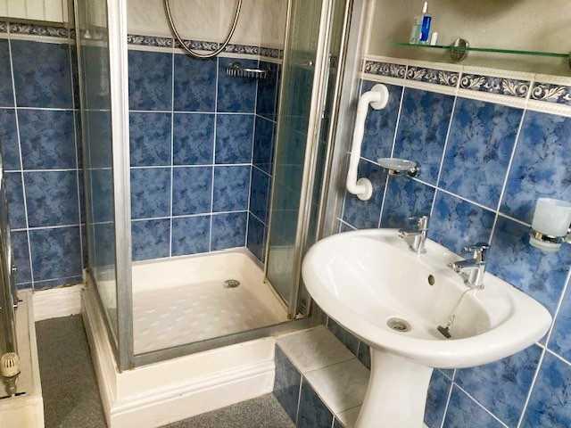 8'2" x 3'10" (2.49m x 1.17m) obscure Upvc double glazed window to side, shower enclosure with Triton electric shower, pedestal wash hand basin, WC, heated towel rail, coved ceiling.