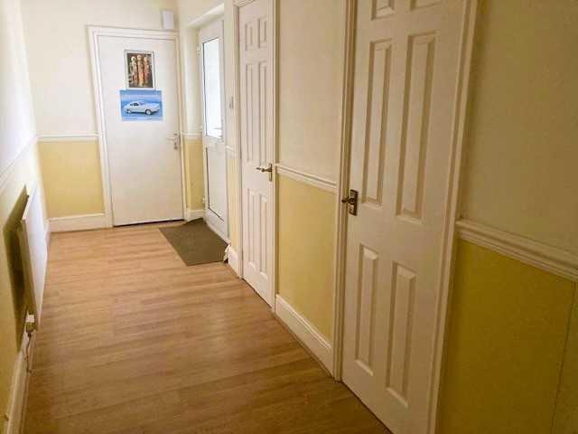 Extra wide entrance hallway (1.45m) with dual entrance coat/storage cupboard, dado rail, laminate flooring, coved ceiling. Access door into the garage, large airing cupboard.