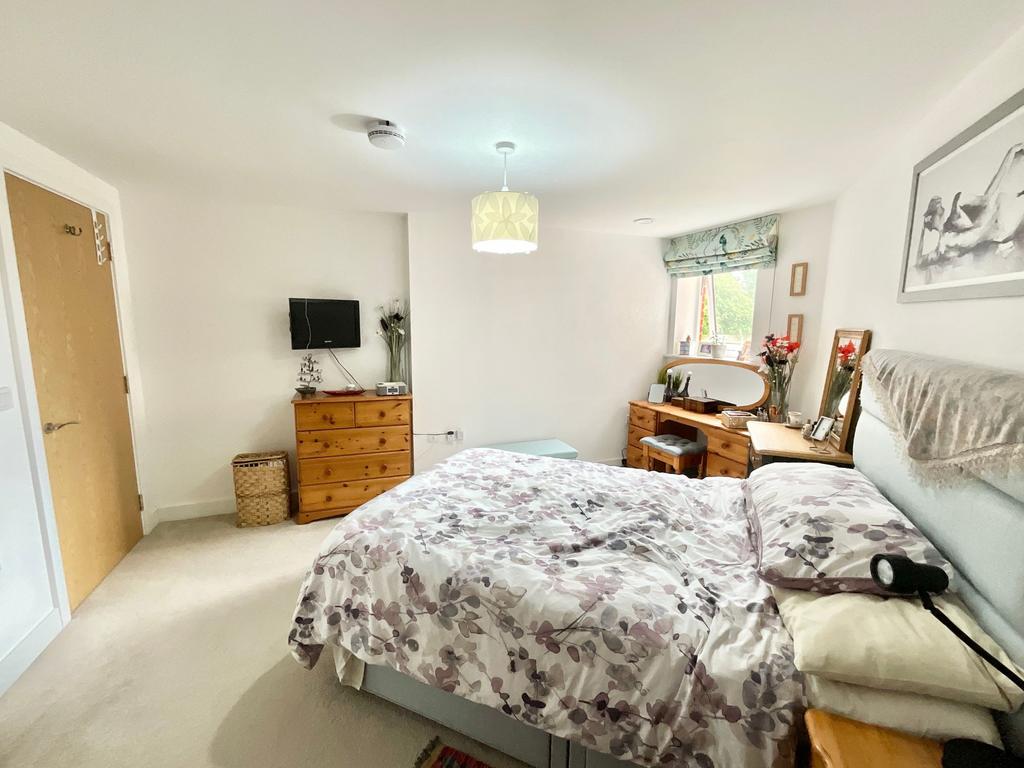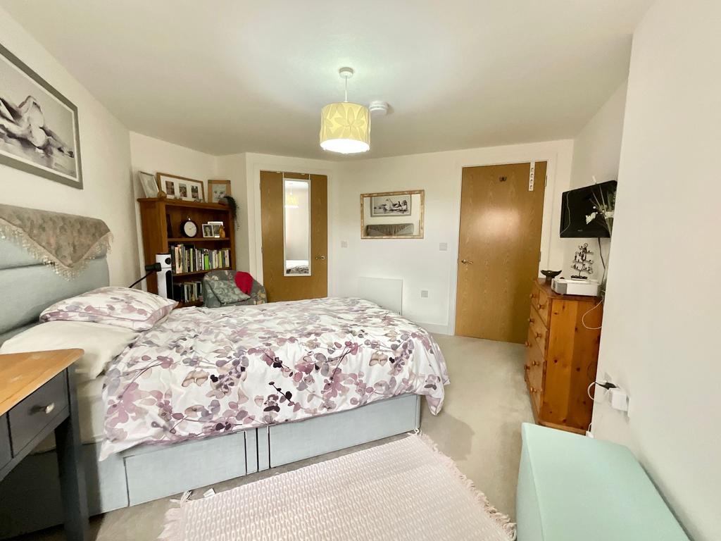 The generous double bedroom features a large walk-in wardrobe providing plenty of storage, while the adjacent modern shower room includes a walk-in shower enclosure, vanity sink unit, and WC – all designed with comfort and ease in mind.