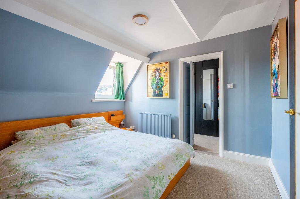From the living area, a barn-style door opens to steps leading down into a versatile third bedroom or study. This comfortable space has a window with sea views and useful eaves storage, and is large enough to accommodate a king-size bed. Equally well-suited as a home office or occasional guest room, it offers flexibility to suit different needs.