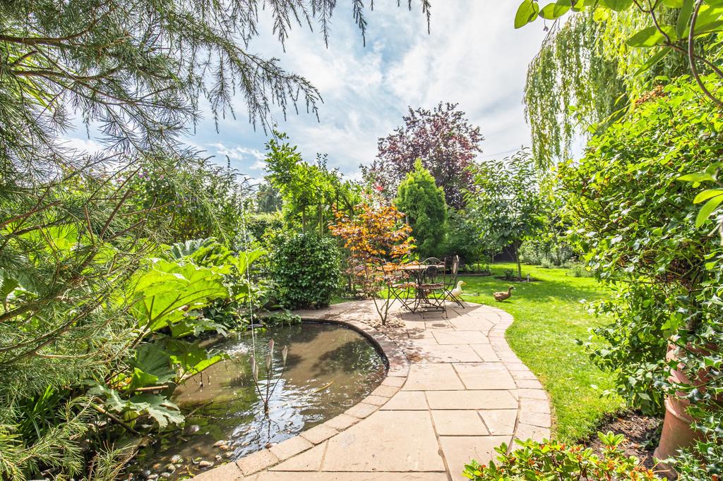 Outside, the gardens are a real highlight – around a quarter of an acre of beautifully planted spaces, mature trees, a wildlife pond, and terraces made for summer evenings. The driveway offers ample parking and leads to two garages, adding to the home’s practicality as well as its charm.
