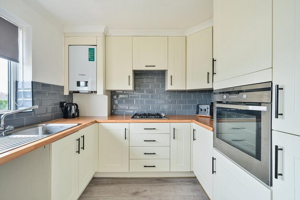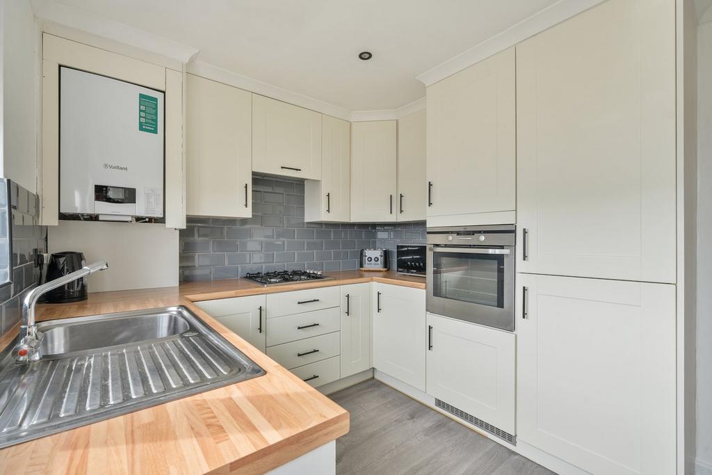 The kitchen has been stylishly fitted to three sides with a range of matching wall and base units, with inset stainless steel sink and drainer with chrome mixer tap, with cupboards beneath including space and plumbing for washing machine. Inset four ring gas hob with extraction over and drawers beneath. Full height unit incorporating built in fridge freezer and built in oven. Recently replaced wall mounted Vaillant boiler for gas fired central heating and hot water.