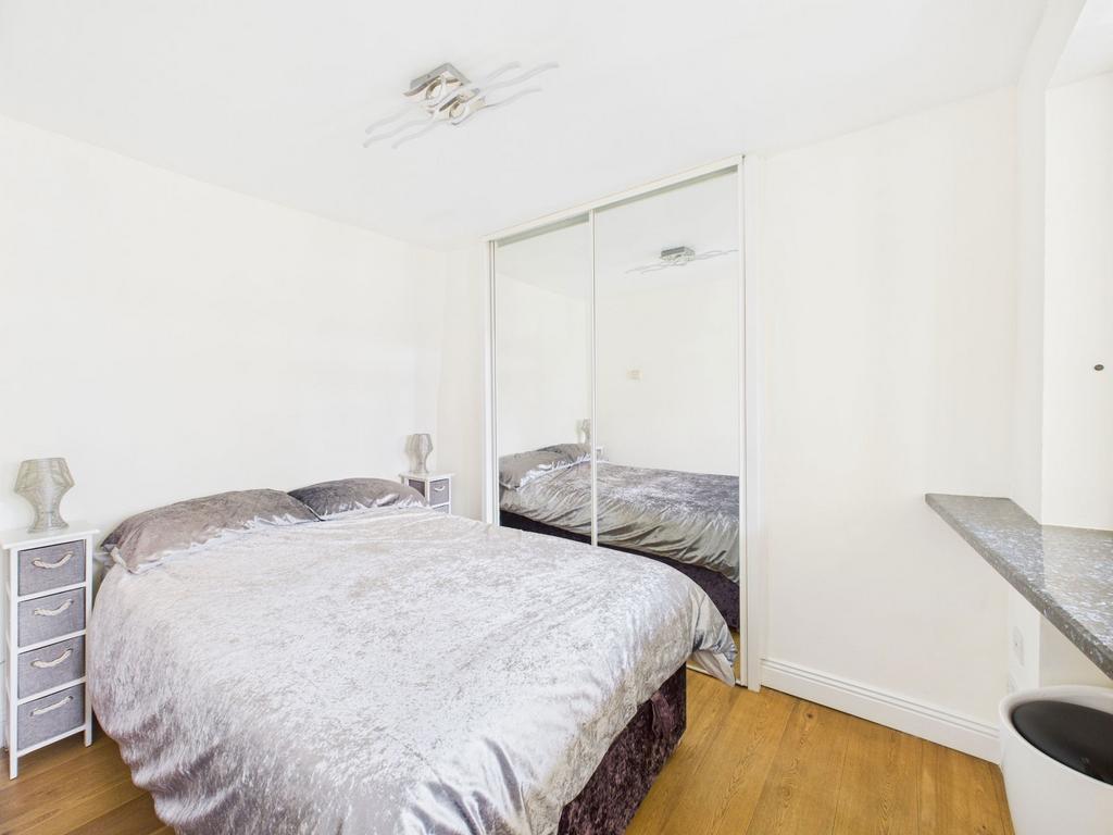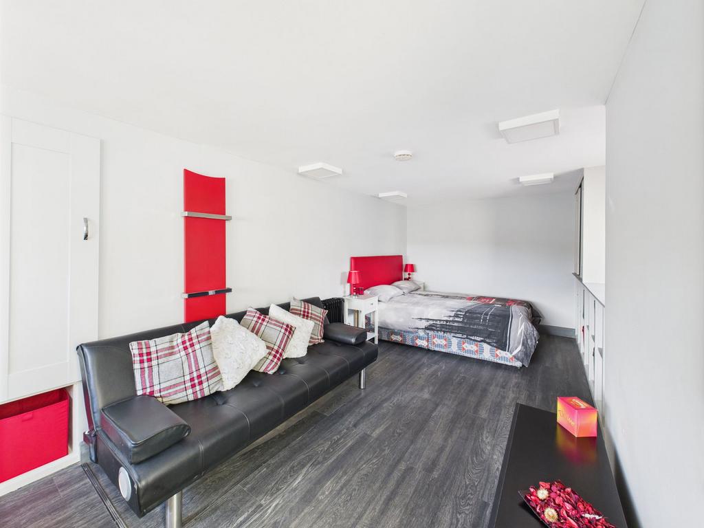 The principal bedroom is an expansive and versatile suite, thoughtfully designed to provide both comfort and functionality. Lined with fitted mirrored wardrobes along one wall, there is no shortage of storage, while the striking sloped ceilings with timber panelling add warmth and character. Velux ceiling skylights and side windows draw in natural light, making the space feel bright and inviting throughout the day. To one end, a dedicated office area offers an ideal spot for home working or quiet study, tucked beneath the skylight with views to the treetops beyond. The room flows naturally into its own private en suite bathroom, completing a true retreat where practicality and relaxation come together. The en suite bathroom is a striking and luxurious space, designed with a sense of both drama and relaxation. Set beneath the sloping ceiling, Velux windows to either side fill the room with soft natural light, enhancing the contemporary finish. At the heart of the room stands a freestanding bathtub, perfectly positioned to create a spa-like feel. Glossy floor tiles reflect the light, while bold red mosaic accents add a splash of colour and personality. With extensive fitted storage running the length of the room and a modern vanity area, this en suite combines style with practicality in a truly impressive way.