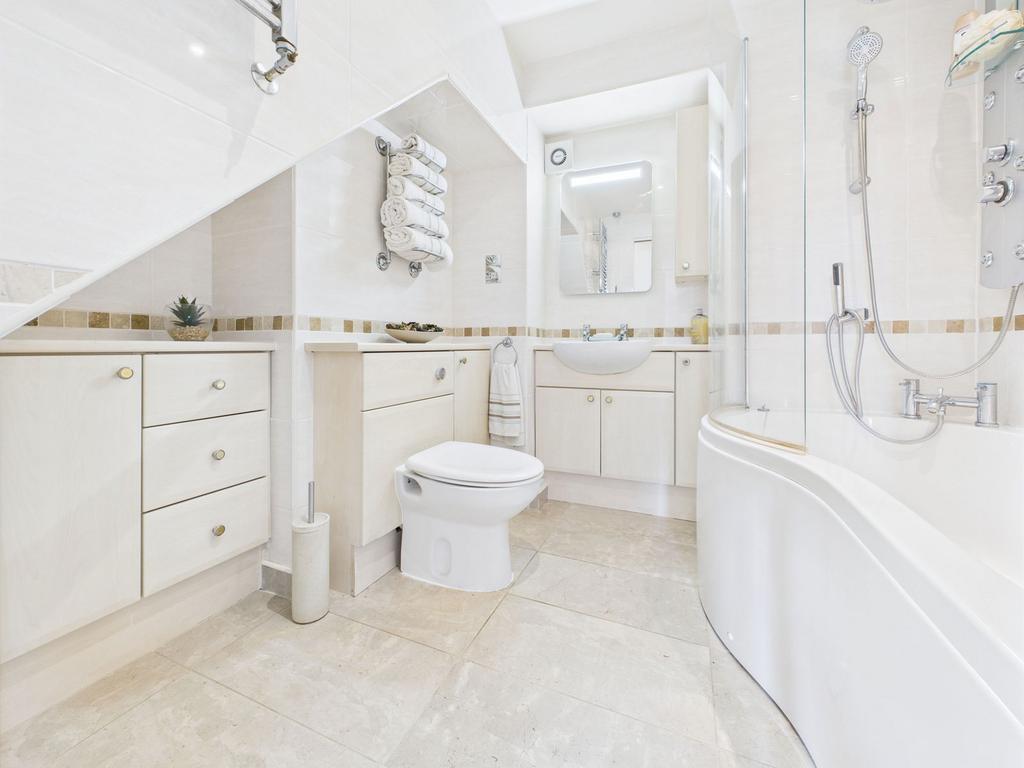 The bathroom is finished in a light, neutral palette, creating a calm and welcoming atmosphere. A modern P-shaped bath with overhead shower and glass screen provides flexibility for both quick showers and long soaks, while fitted cabinetry around the basin and WC offers excellent storage. Subtle tiled detailing adds a touch of warmth and character, and the thoughtful layout makes this bathroom both stylish and practical for everyday family living.
